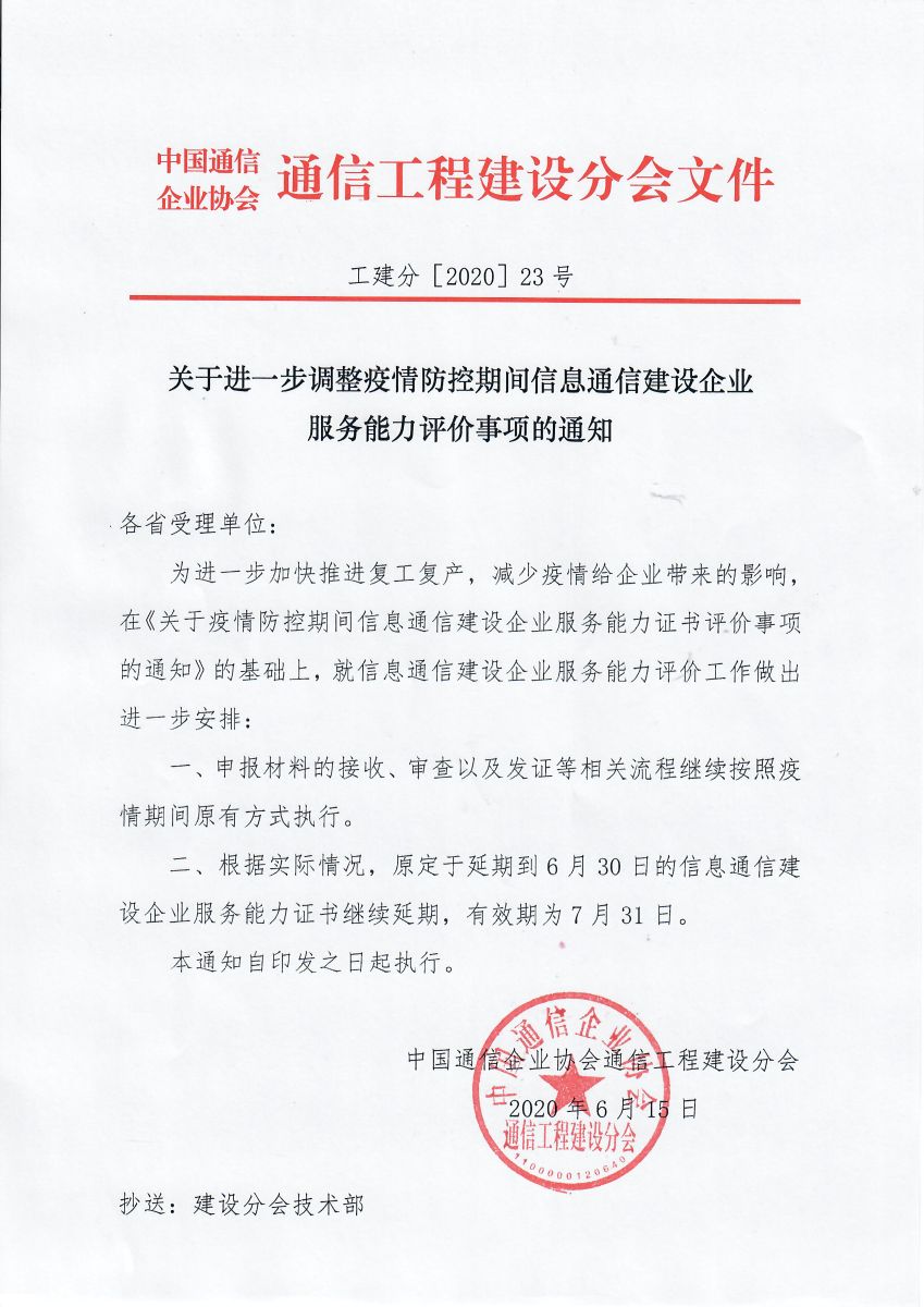 关于进一步调整疫情防控期间信息通信建设企业服务能力证书评价事项的通知