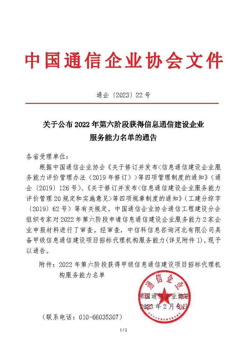 关于公布2022年第六阶段获得信息通信建设企业服务能力名单的通告