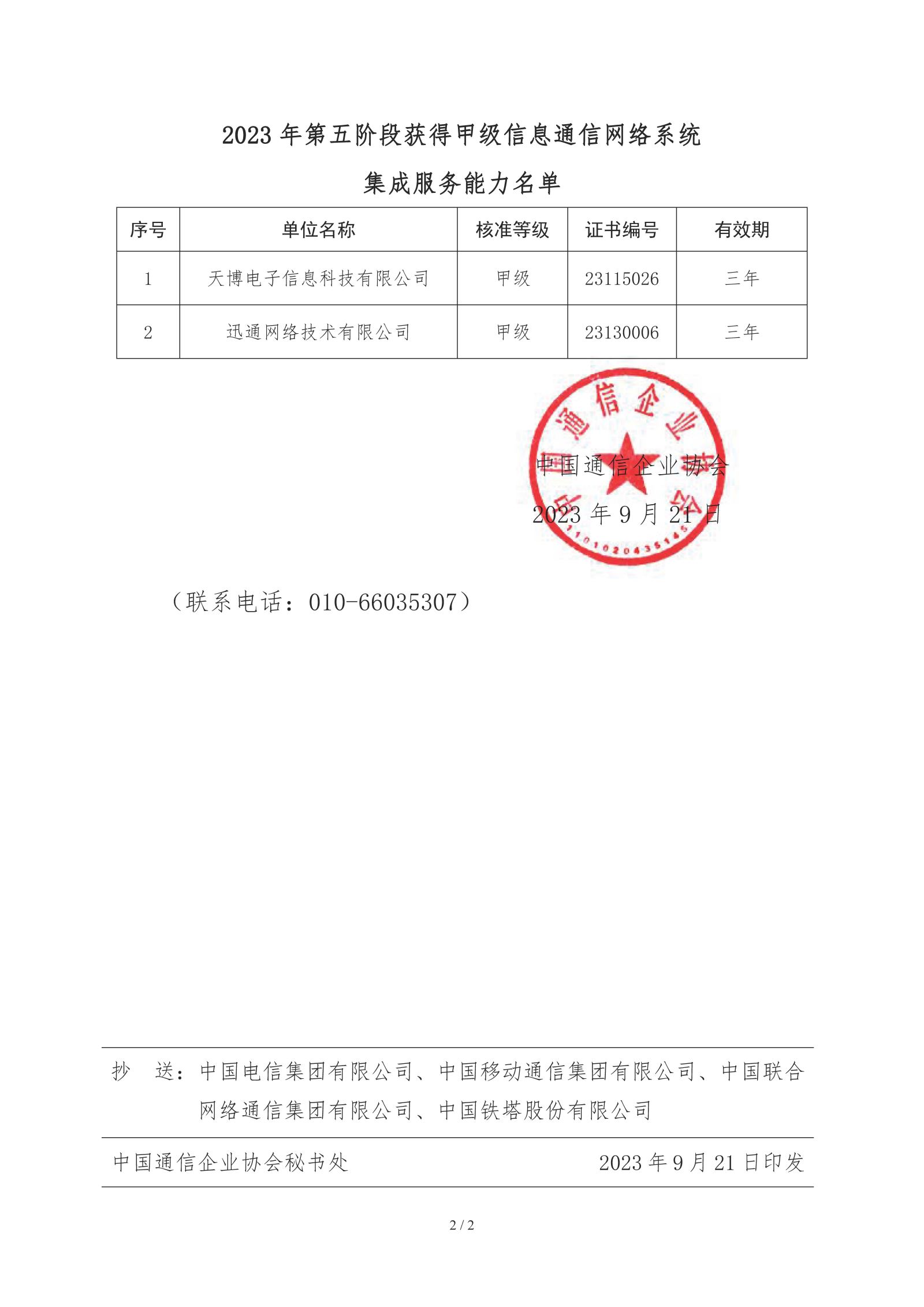 关于公布2023年第五阶段获得信息通信建设企业服务能力名单的通告