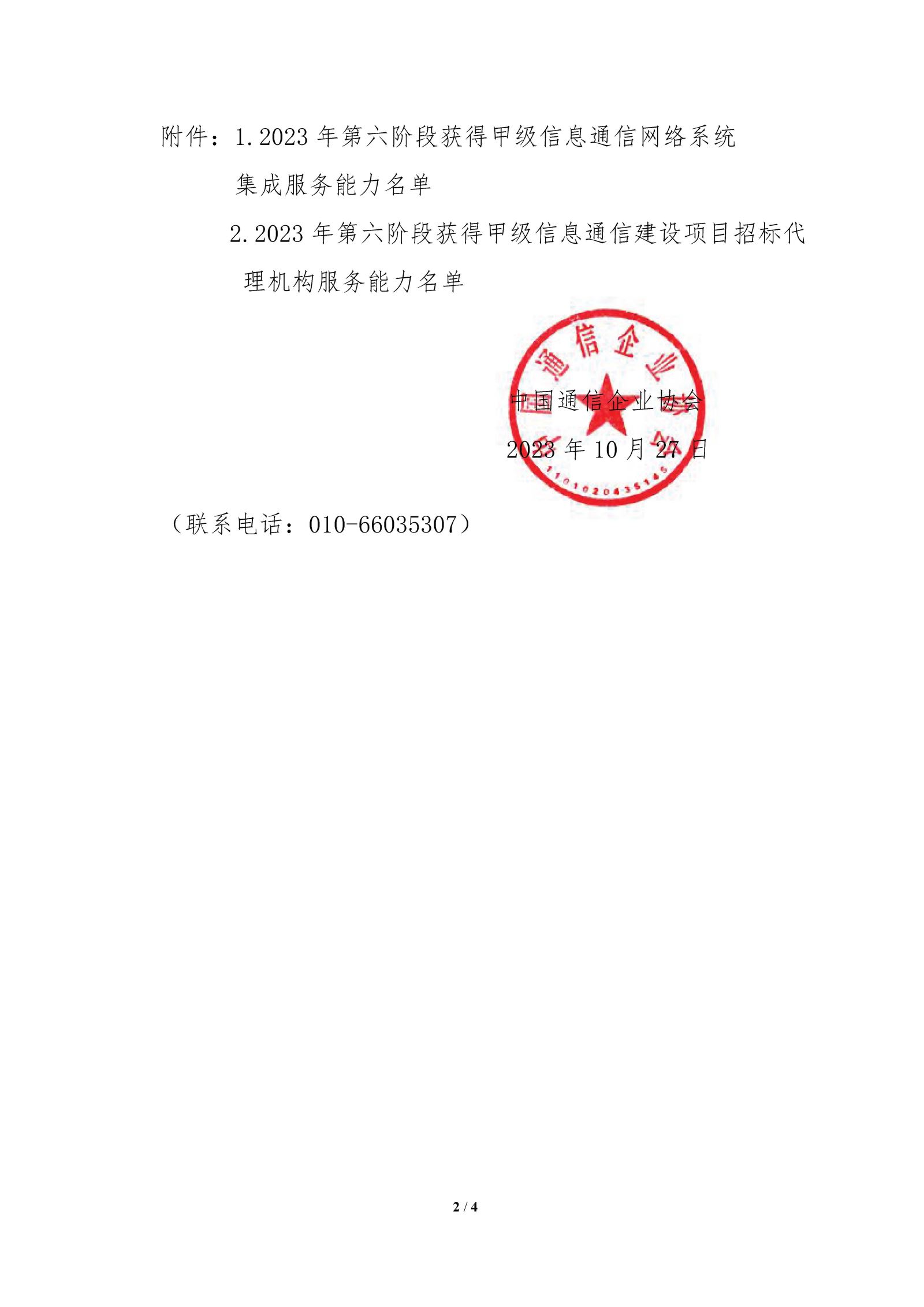 关于公布2023年第六阶段获得信息通信建设企业服务能力名单的通告