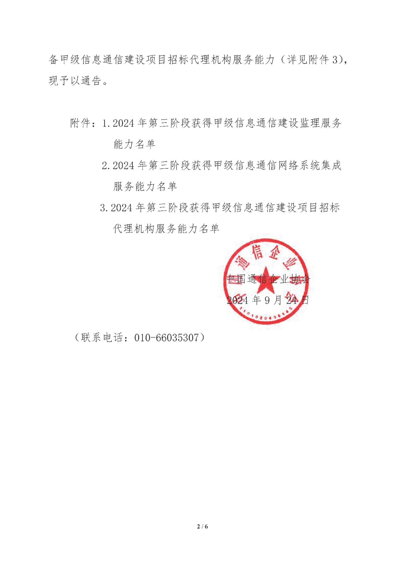 关于公布2024年第三阶段获得信息通信建设企业服务能力名单的通告