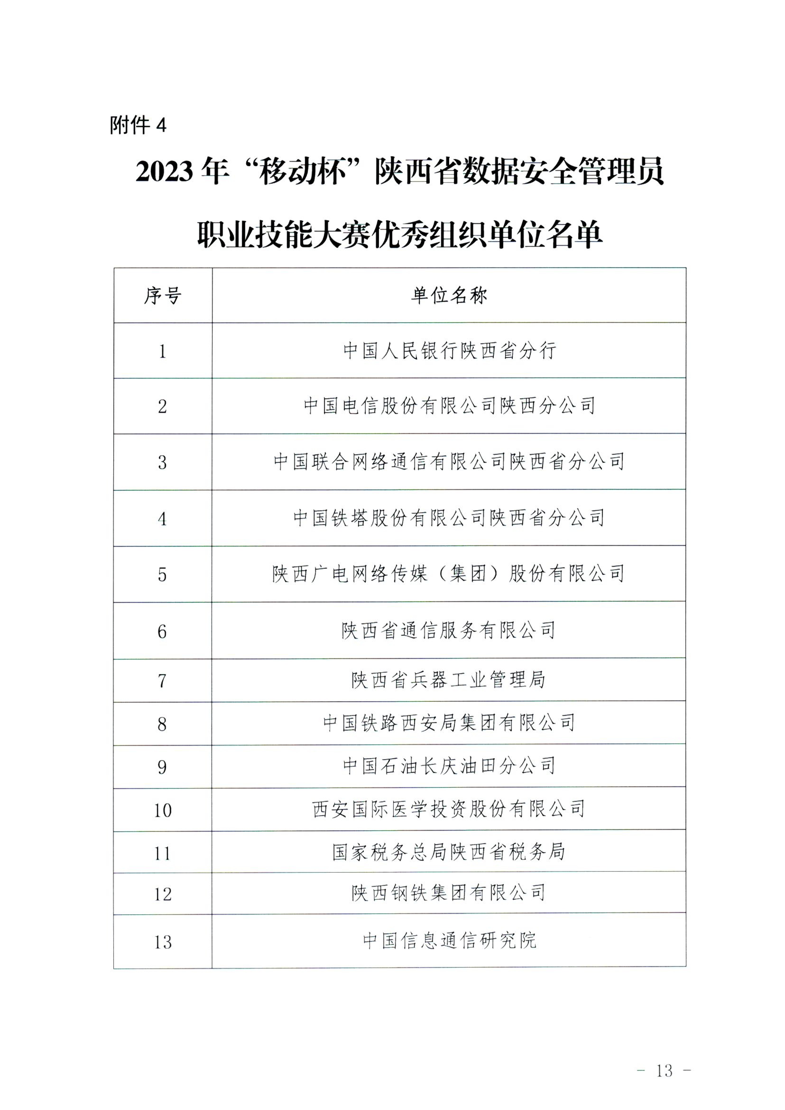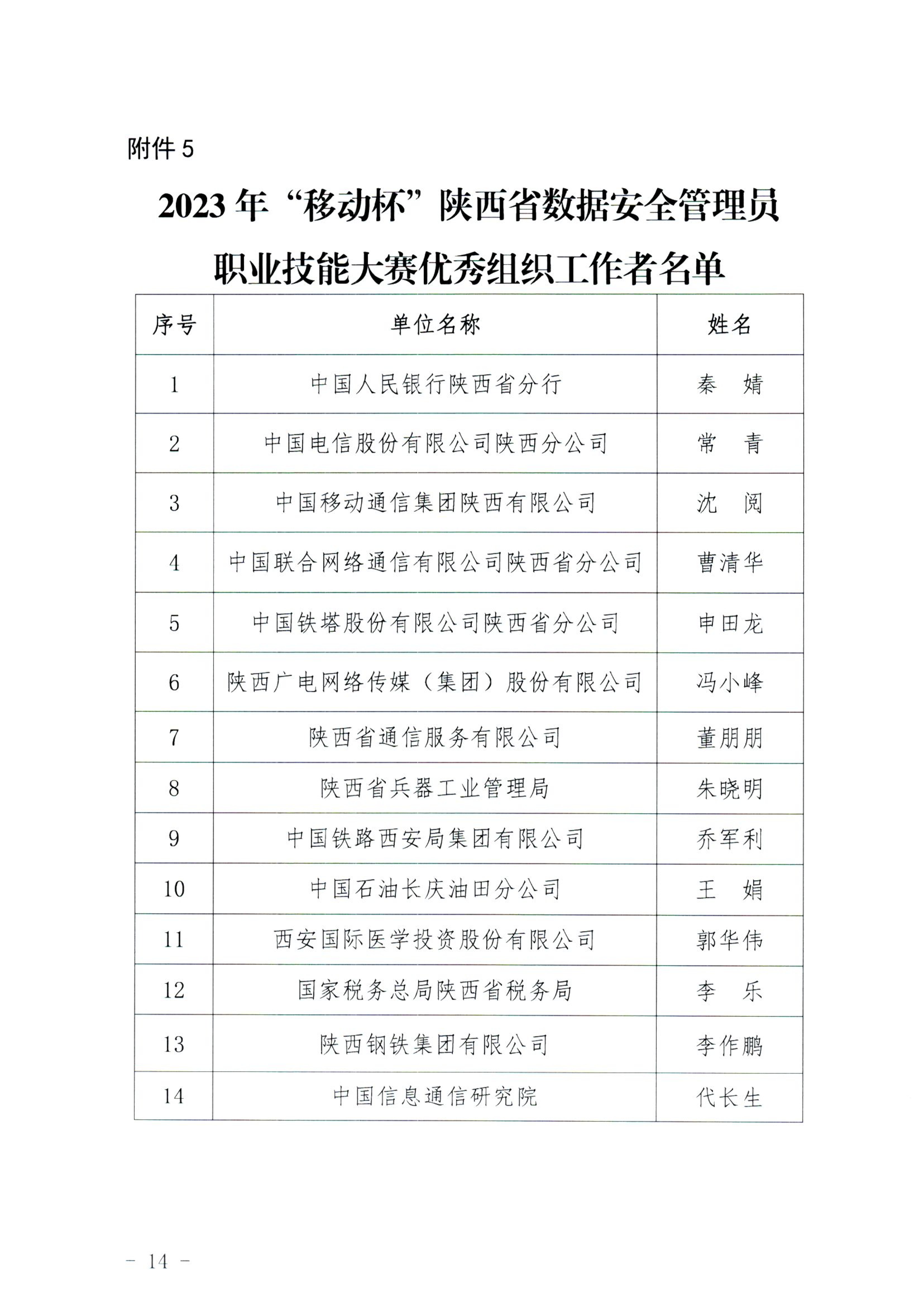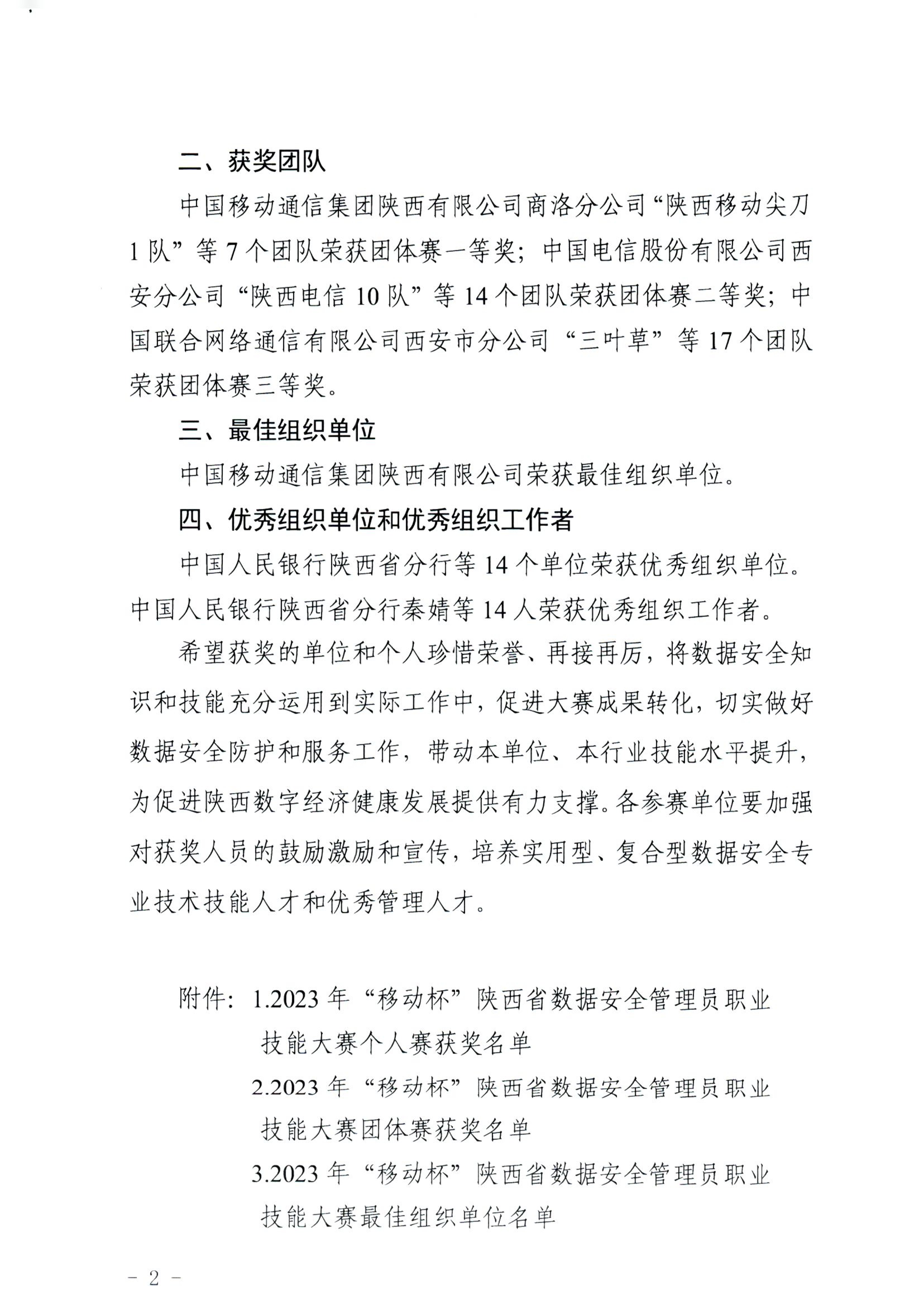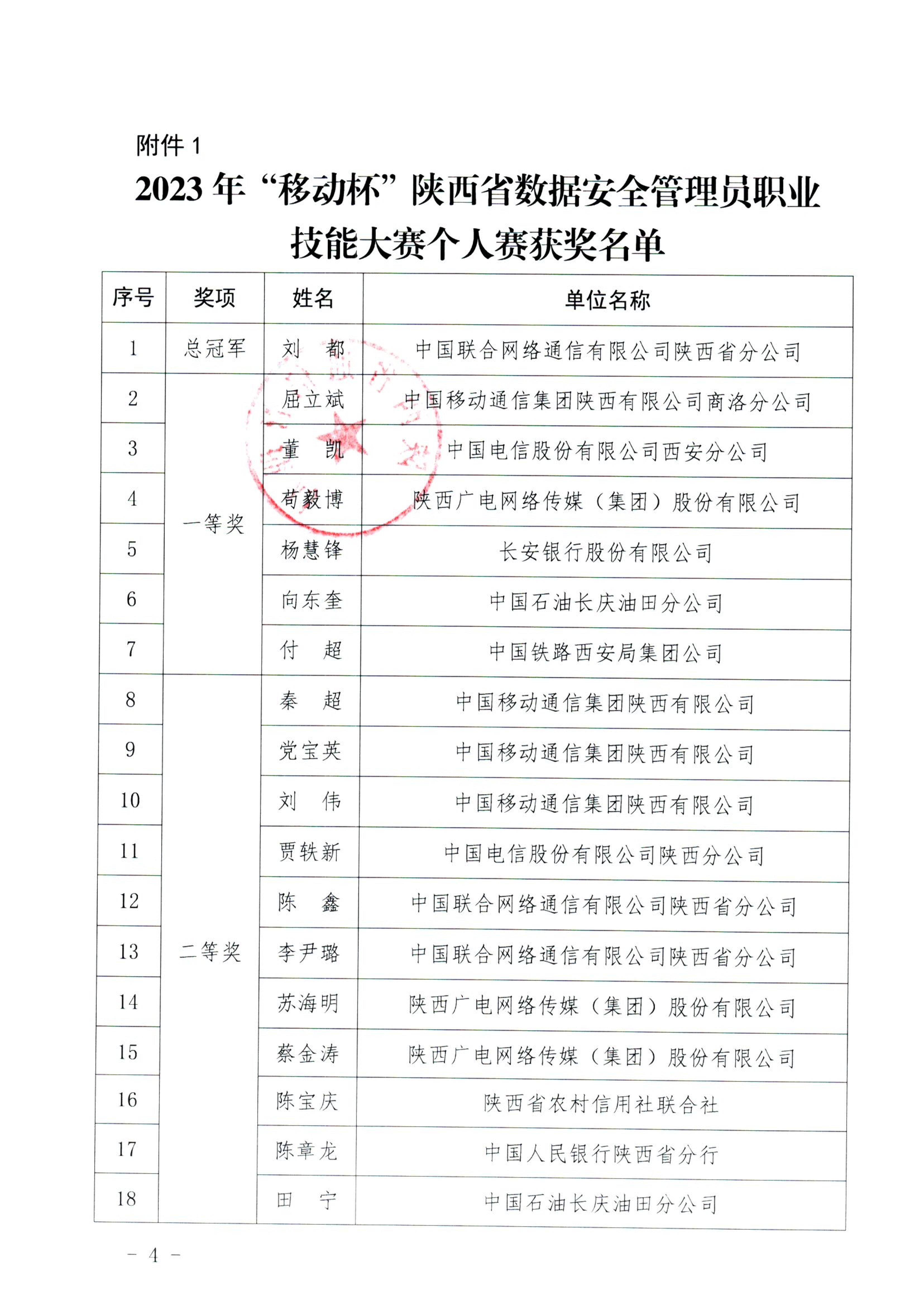关于2023年“移动杯”陕西省数据安全管理员职业技能大赛获奖名单的通报